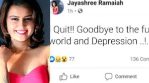 கன்னட பிக்பாஸ் சீசன் 3-ல் பங்கேற்று ரசிகர்கள் மத்தியில் பிரபலமடைந்தவர் தான் ஜெயஸ்ரீ ராமய்யா. இவர் கன்னடத்தில் கன்னட கொத்திலா, உப்பு குலி காரா ஆகிய படங்களிலும் நடித்துள்ளார். இந்நிலையில், நேற்று ஜெயஸ்ரீ ராமையா தனது ஃபேஸ்புக் பக்கத்தில், நான் மிகுந்த மனசோர்வில் உள்ளேன். இந்த உலகத்தை விட்டு விடைபெறுகிறேன் என்ற பதிவு ஒன்றை வெளியிட்டிருந்தார். இதனை கண்ட அனைவரும் அ திர் ச்சி அ டைந்தனர்.