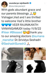 தற்பொழுது அவர் தனது ட்விட்டர் பக்கத்தில் குழந்தையின் கையை பிடித்தவாறு புகைப்படம் ஒன்றை வெளியிட்டு வெளியிட்டுள்ளார். அப்பதிவில் அவர் கூறியுள்ளதாவது ‘கடவுளின் ஆசிர்வாதத்துடனும், பெற்றோர்கள் ஆசிர்வாதத்துடன் எனது கணவர் விஷாகன், எனது முதல் குழந்தை வேத் மற்றும் நான் இன்று வேத் தம்பி வீர் ரஜினிகாந்த் வணங்காமுடியை வரவேற்பதில் அளவற்ற மகிழ்ச்சி அடைகிறோம்’. என்று அவர் அதில் குறிப்பிட்டுள்ளார்.