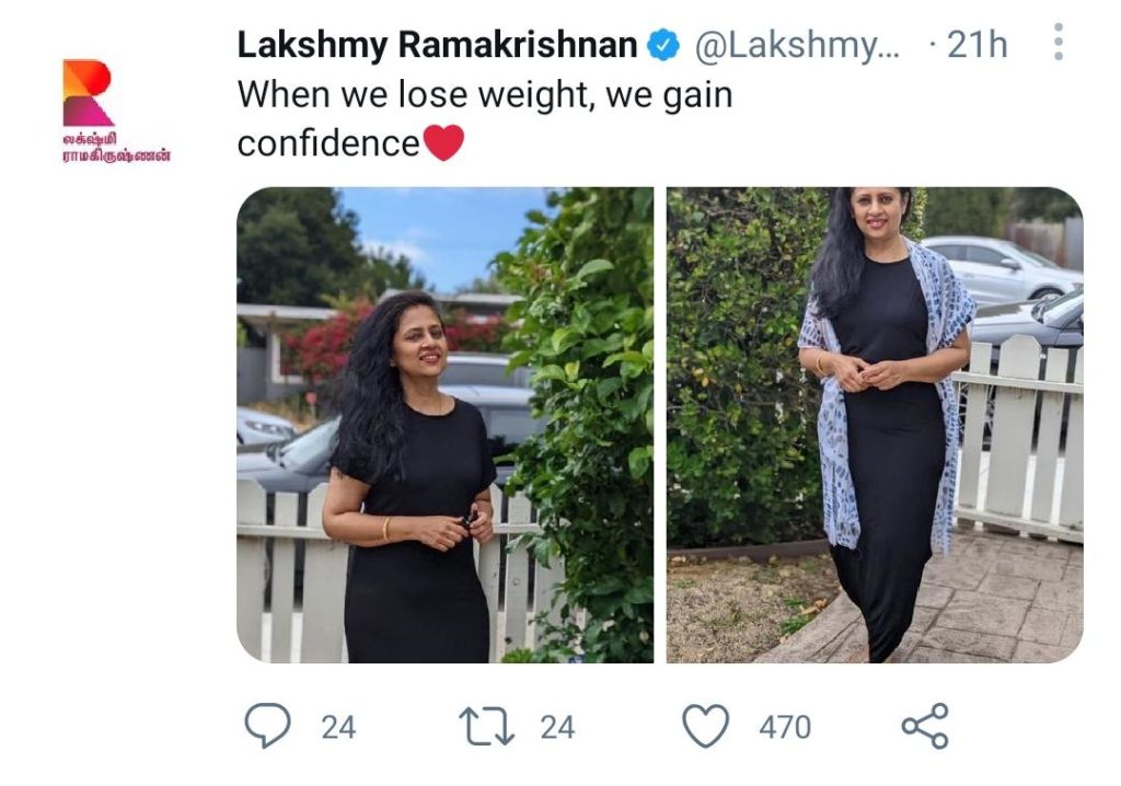 lakshmi ramakrishnan இப்படி ஒரு நிலையில் தனது இன்ஸ்டகிராம் பக்கத்தில் ஆக்டிவாக இருக்கும் நடிகை லக்ஷ்மி ராமகிருஷ்ணன் அவர்கள் மாடர்ன் உடையில் இருக்கும் சில புகைப்படங்களை வெளியிட்டு உள்ளார்கள்.அதில் அவர் உடல் இடையை குறைத்தால் தன்னம்பிக்கை அதிகமாகும் என பதிவிட்டுள்ளார்.