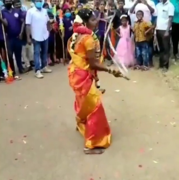 தமிழகத்தில் மணக்கோலத்தில் மணப்பெண் இரண்டு கைகளில் சிலம்பம் மற்றும் சுருள் வாள் வீசி அசத்திய வீடியோ வைரலாகி வருகிறது.