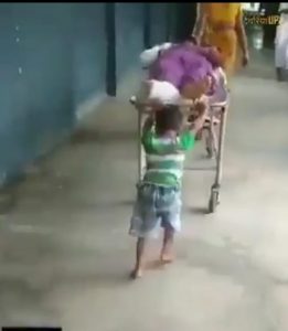 உத்திர பிரதேஷ் பர்காஜ் மாவட்டத்தில் உள்ள கவுரா கிராமத்தைச் சேர்ந்தவர் சேதி யாதவ். உடநிலை சரியில்லாத இவரை, எனவே இவரது மகள் இவரை அருகில் உள்ள மருத்துவமனையில் சேர்த்து கவனித்து வருகின்றார். இந்நிலையில் இவரது 6 வயது மகனும் இவருடன் இருந்து வந்துள்ளார் என்பதாக கூறப்படுகிறது. இந்நிலையில் சிறுவனின் தாய் ஸ்ட்ரெச்சரை முன்பக்கம் இழுத்துக்கொண்டு போக, சிறுவன் பின்னால் இருந்து தள்ளிச் செல்லும் காட்சி இணையத்தில் தற்போது வெளியாகியுள்ளது.