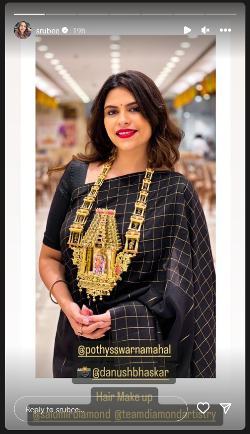 இந்நிலையில் நடிகர் நகுல் மனைவி சுருதி தனது கழுத்தில் மூன்று கிலோ தங்கத்தில் செய்த நெக்லஸ் ஒன்றை அணிந்து உள்ளார். ஸ்ரீவில்லிபுத்தூர் ஆண்டாள் கோவில் வடிவம் அந்த நெக்லஸில் இடம் பெற்றுள்ளது.அந்த போட்டோவை அவர் இன்ஸ்டாகிராம் பக்கத்தில் பகிர்ந்து உள்ள நிலையில் இதனை பார்த்த பலரும் ஆச்சரியமடைந்துள்ளனர்.