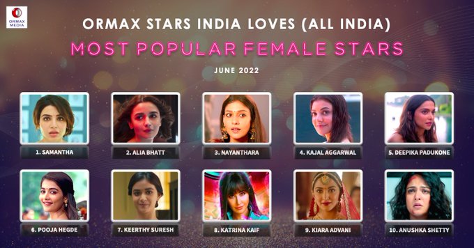 இரண்டாவது இடத்தில் ஆலியா பட், மூன்றாவது இடத்தில் நயன்தாரா, நான்காவதாக காஜல் அகர்வால், ஐந்தாவது இடத்தில் தீபிகா படுகோனே, ஆறாவது இடத்தில் ராஷ்மிகா மந்தனா, 7வது இடத்தில் அனுஷ்கா, எட்டாவது இடத்தில் கத்ரீனா கைஃப், 9வது இடத்தில் கீர்த்தி சுரேஷ் மற்றும் பத்தாவது இடத்தில் பூஜா கிட்டே ஆகியோர் உள்ளனர். இதன் மூலம் பாலிவுட் நடிகைகளை ஓரம் கட்டி முதல் இடத்தை பிடித்துள்ளார் சமந்தா.