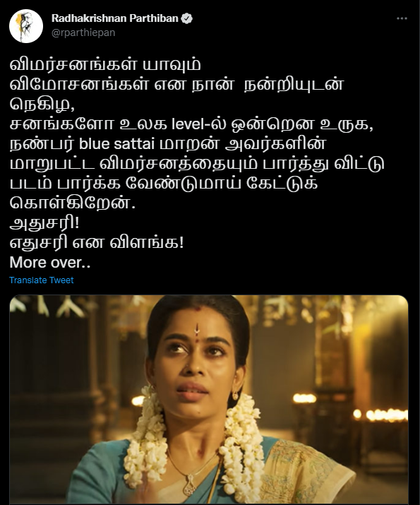 ஆனால் இந்த படத்திற்கு வழக்கம் போல Blue Sattai மாறன் எதிர்மறையாக பேசியுள்ளார். இந்நிலையில் அவருக்கு பதிலடி கொடுக்கும் விதமாக நடிகர் பார்த்திபன் ஒரு பதிவை போட்டுள்ளார். அந்தப் பதிவு தற்போது ட்விட்டரில் வைரலாகி வருகிறது.
